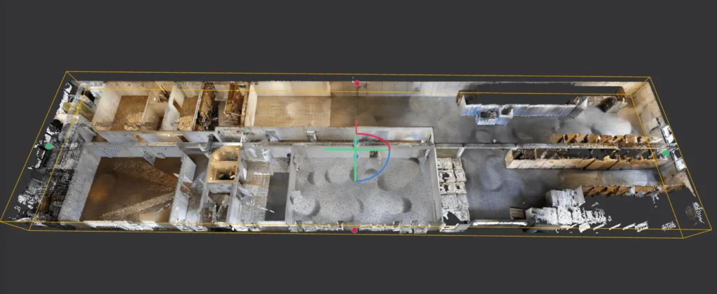 Das die vorhandene Bürofläche im Bestandsgebäude sollte neu gestaltet werden. Es waren keine digitalen Planungsgrundlagen vorhanden. Zur Erstellung von digitaler Planungsgrundlage wurde ein 3D-Scan via NavVis VLX durchgeführt und ein 3D-Modell der Bürofläche erstellt. Besondere Herausforderung war es die im Bestand denkmalgeschützte Holzvertäfelung in das 3D-Modell zu übernehmen.